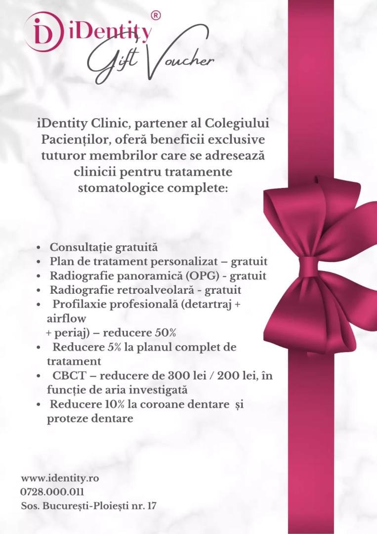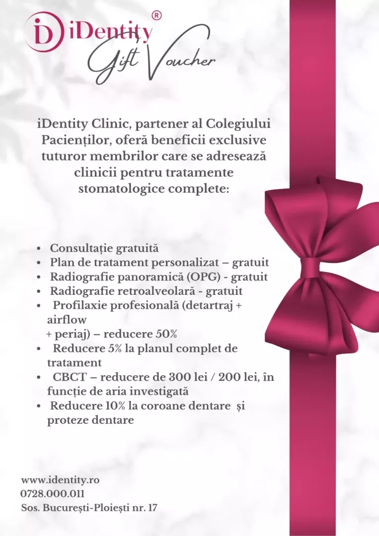 Pacienții care se adresează clinicii iDentity și menționează apartenența la Comunitatea Colegiul Pacienților beneficiază automat de: