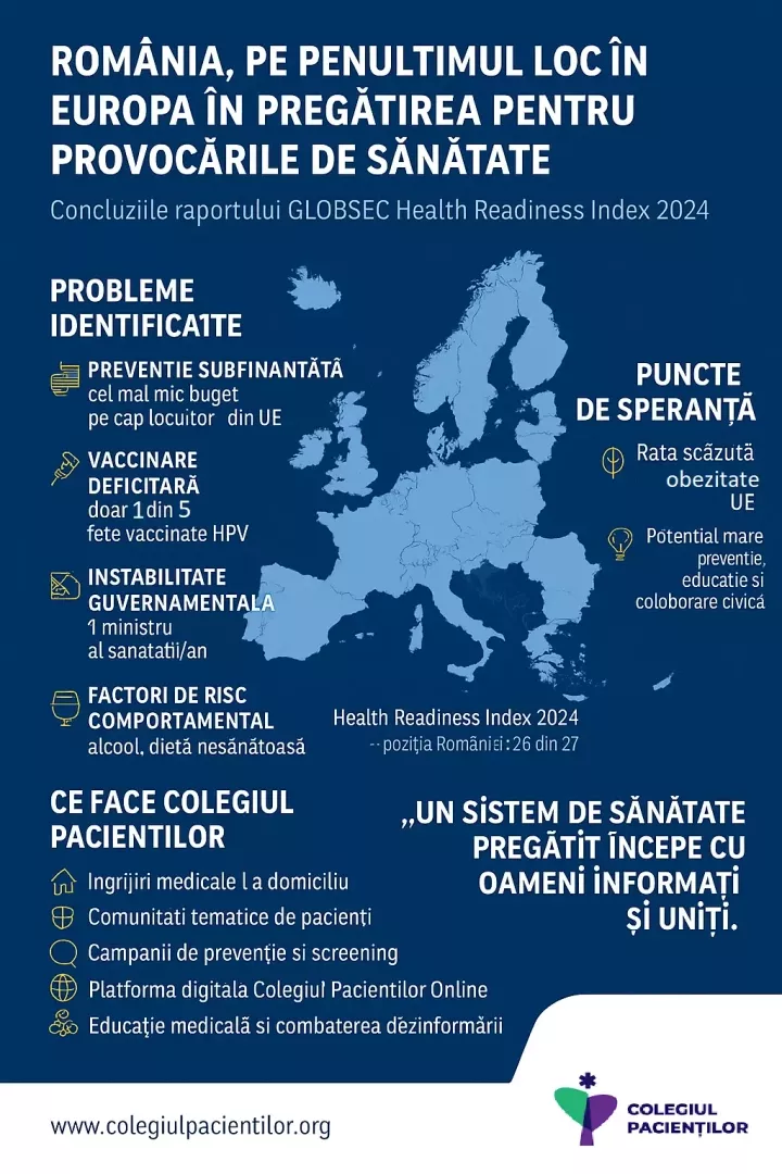 Conform celui mai recent GLOBSEC Healthcare Readiness Index 2024, prezentat la CEE Patient Engagement Forum de la București, România se află pe penultimul loc în Uniunea Europeană în ceea ce privește capacitatea de a răspunde provocărilor actuale și viitoare din sistemul de sănătate.